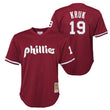 Mitchell & Ness Youth Philadelphia Phillies John Kruk 1991 MLB Authentic Jersey features pull-on closure, Cooperstown player mesh bp jersey, mesh bp body design, V-neck collar, jock tag at lower left, tackle twill logo, number, and player name.
