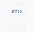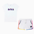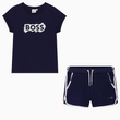 Navy blue t-shirt for girls by BOSS Kidswear. Made from a soft cotton jersey it features a colorful logo print on the front and shorts from Boss. Made of cotton jersey. It has white trims and a brand logo on one leg in silver. It has an elasticated waistband with a silver logo on the back.