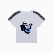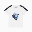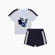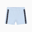 White and blue shorts and t-shirt set for baby and younger boys by BOSS Kidswear. Made from soft organic cotton jersey the set consists of a white t-shirt with a 3D tonal blue logo on the front and white and navy blue logo tapes on the shoulders. There are poppers on one shoulder for easy changing. The matching light blue shorts have an elasticated waistband ensuring a comfortable fit and have navy blue and white logo tapes down the side seams. Comes beautifully presented in a BOSS-branded gift box.