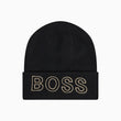Hugo Boss Kid’s Logo Pull on Beanie features bright red pull-on hat with gold logo on front and same on tab at the side. A sparkling choice in accessories.
